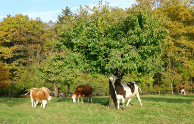 Da die Landwirtin sich wegen Futtermangel (Trockenheit 2015) von einigen Kühen trennen musste, rief sie mich Mitte Juli an, ob ich noch Interesse an Flora hätte. Klar - ich war vor Freude völlig aus dem Häuschen und organisierte alles. Unglücklicherweise wurde genau an dem Tag, an dem wir Flora holen wollten unsere Katze Delia überfahren… Doch ich musste stark sein für Flora und mein Mann Christofer fuhr trotz grenzenloser Trauer den Viehtransporter. Eine weitere Kuh (Gusti) leistete Flora Gesellschaft. Beide sind nun nicht mehr wie zuvor in Anbindehaltung im Stall, sondern können ihr Leben mit anderen Kühen auf der Weide genießen.